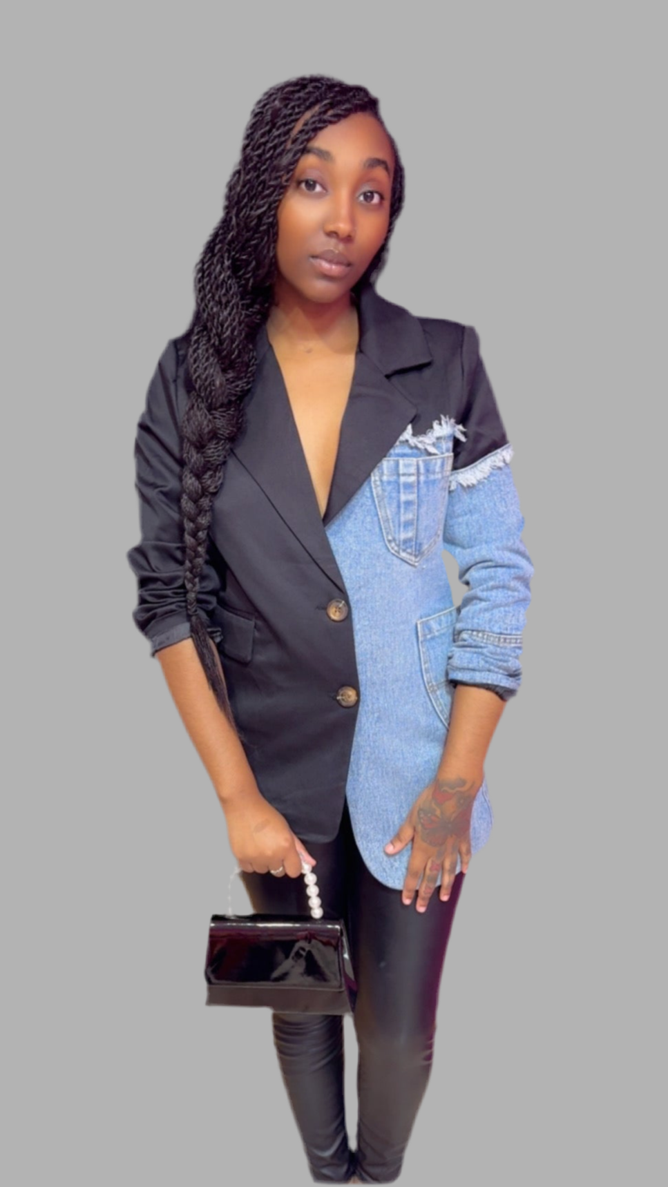 This Half Denim Blazer Is Sure To Turn Heads! With The Unique Mix Match Design, You Can Wear Her To Work Or Have A Night Out On The Town! Large But Runs Small In The Arm & Back Area!